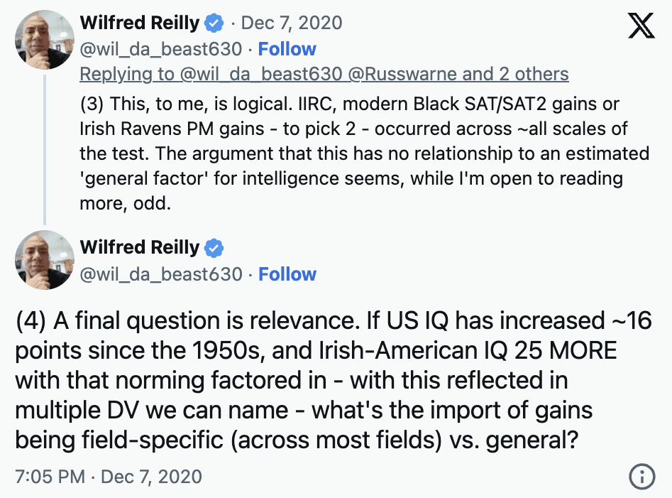 The third reason that it matters whether Flynn effect gains are on g or not is that it tells us something about the potential to narrow or close average IQ gaps between groups. If Flynn effect gains were on g (or on both g and non-g abilities), it would increase the likelihood that average IQ gaps between groups could close completely. Unfortunately, this is not the case. The non-g nature of the Flynn effect implies that — within the current range of environments in wealthy countries — further environmental interventions are probably not going to close the g-caused portion of IQ differences (because of that portion’s resistance to known environmental influences that are typically found in wealthy nations).