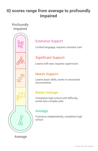 IQ 55-69: People in this range typically need some support. They can often learn basic academic skills (reading at an elementary level, simple math), work in structured environments, and live semi-independently with oversight. Many attend special education programs during school years.