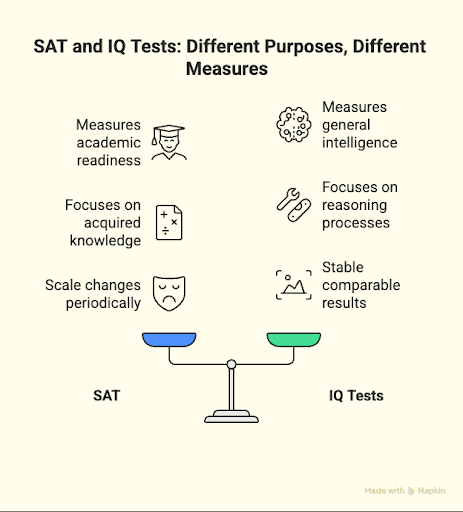 Research has consistently shown that SAT scores correlate strongly with IQ scores. Studies have found correlations between .7 and .8, depending on the population. This overlap means that both tests capture many of the same underlying cognitive processes. Their differences are in more of the tasks that each test uses and their reasons their scores are used. Fundamentally, there is enough overlap in underlying abilities that the SAT functions as an IQ test.